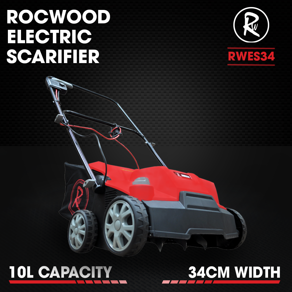 The RocwooD RWES34 is a powerful yet low maintenance electric scarifier. Perfect for revitalising spongy lawns, fixing patchy grass growth, and encouraging drainage from areas of your lawn prone to flooding, this scarifier will leave you with a beautiful, healthy, green carpet of lawn and save you countless time from having to rake or fork your grass to keep it weed-free. The RWES34 grass aerator's large working width of 340mm will get the ground aerated in no time, improving your lawn drainage and grass growth whilst also protecting your lawn from waterlogging and disease. The RWES34 is ideally suited to small to medium-sized grassy areas and lawns. Only weighing 17kg, the RWES34's robust wheels make this Scarifier easy and comfortable to push around your garden, and the specially designed wide tread helps protect your lawn from damage whilst using the scarifier. It also has foldable handles for easy, compact storage in your garage or shed. This lawn aerator's adjustable scarifying heights ranging from -12mm to +8mm are simply controlled from one adjustment dial. Putting you in control over the finish of your lawn and ensuring that all moss, thatch and weeds are removed from the root. With a powerful 1600W/1.6kW motor, this provides plenty of power to get the job done quickly and effectively and its generous power cable will give you plenty of working room to save you from having to use an extension cable. A massive 40L grass collector box collecting weeds and moss as you go, reducing the time stopping to empty the grass collector getting the job done as quickly as possible. As this lawn scarifier is electric, it requires low maintenance. Don't worry about mixing oils, dealing with stale fuel, or other routine maintenance required with petrol machinery. The RWES34 Electric Scarifier is designed with safety in mind. The machine will stop automatically if you let go of the operator lever, so you're always in control.